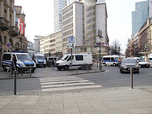 So gut abgesichert und unter strenger Beobachtung war ich noch nie bei einem Locationcheck. Heute Vormittag zwischen mind. einem Dutzend Polizeiwagen auf dem Kaiserplatz in Frankfurt.