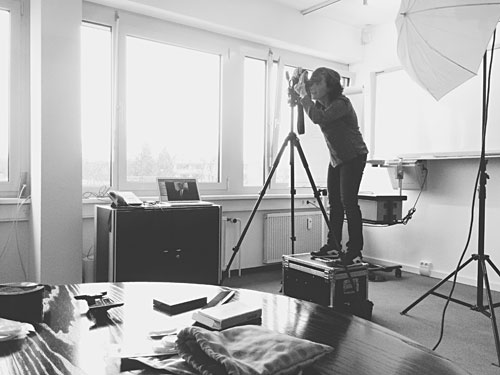 Improvisierte Beinverlängerung – alles für das perfekte Foto! Portraitsession beim Kunden MMI. Foto: © Mario Drescher