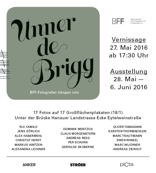 Mit einer außergewöhnlichen Plakataktion machen wir als Mitglieder des Berufsverbandes Freie Fotografen und Filmgestalter (BFF) in Frankfurt auf unser Schaffen aufmerksam. 17 Fotografinnen und Fotografen zeigen vom 28. Mai an ausgewählte freie Arbeiten in großen Formaten unter einer Eisenbahnbrücke – eben „unner de Brigg“, wie der Hesse sagt. Die 11-Tage-Ausstellung beginnt am 27. Mai mit einer Vernissage auf offener Straße, zu der jeder kommen kann.